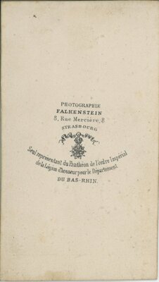 Fotografie einer Dame, die sich mit ihren linken Ellenbogen auf eine Hohe Stuhllehne stützt. Sie trägt einen mittelhellen, weiten Rock mit breitem Gürtel, einen Bolero und eine helle Bluse mit einer langen Knopfleiste. Ihre langen, welligen Haare sind nach hinten frisiert. Ihr Gesicht ist kaum zu ahnen, da der Abzug oben sehr stark verblasst ist. Unter dem Bild: Falkenstein Photogr. Auf der Rückseite: Photographie FALKENSTEIN 8, Rue Merciere 8 Strasbourg
