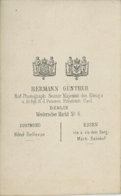 Auf dem Bild ist ein etwas schüchtern blickender junger Mann zu sehen, der eine dunkle Jacke und ein helles Hemd trägt. Amseinem Kragen hat er eine schmale lange Fliege. Er ist bartlos und trägt seine kurzen Haare ohne Scheitel . Auf der Rückseite: HERRMANN GÜNTHER Hofphotograph seiner Majestät des Königs Berlin Werderscher Markt No 6
