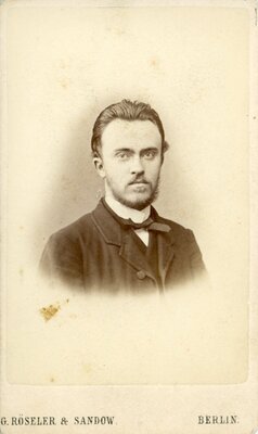 Die Abbildung zeigt einen Jugen Herren mit kurzem Vollbart und nach Hinten gekämmten glatten dunklen Haaren. Er tägt ein dunkles Sakko und eine dunkle Weste. Er schaut entschlossen in die Kamera. Unter dem Bild: G. Rösler & Sandow Berlin Auf der Rückseite: Atelier für Photographie G. Rösler & Sandow Berlin Friedrichstraße 100