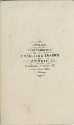 Die Abbildung zeigt einen Jugen Herren mit kurzem Vollbart und nach Hinten gekämmten glatten dunklen Haaren. Er tägt ein dunkles Sakko und eine dunkle Weste. Er schaut entschlossen in die Kamera. Unter dem Bild: G. Rösler & Sandow Berlin Auf der Rückseite: Atelier für Photographie G. Rösler & Sandow Berlin Friedrichstraße 100