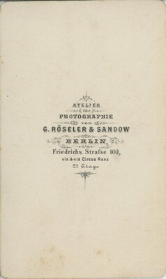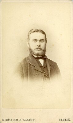 Brustporträt eines jungen Herren in frontal Ansicht. Er hat ein breites Gesicht, mit dichtem, kurzen Vollbart. Seine kurzen Haare sind vom Mittelscheitel zu den Seiten gekämmt. Er blickt gerade in die Kamera. Seine Jacke und Weste sind dunkel. Unter dem Bild: G. Rösler & Sandow Berlin Auf der Rückseite: Atelier für Photographie G. Röseler & Sandow Berlin Friedrichstraße 100