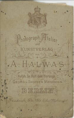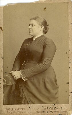 Die Karte zeigt eine etwas kräftige Dame in dunklen, hochgeschlossenen Kleid mit hellem Kragen. Ihre Hände hat sie auf eine Sofalehne gelegt, ihr Gesicht ist beinah im Profil zu sehen. sie blicktweit nach links aus dem Bild. Ihre Haare sind straff nach hinten frisiert und als Zopf zu einem Knoten hochgesteckt. Unter dem Bild: Adolf Halwas Hofphotograph Auf der Rückseite: Photograph. Atekier u. Kunstverlag A. HALWAS Hofphotograph des Herzogs Georg v. Sachsen Meiningen Berlin Friedrichstr. 185