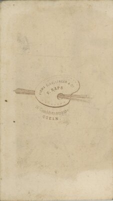 Frontalbildnis einer, hinter einem Stuhl stehenden Dame in dunklen Kleid mit bodenlangem Rock. der Rock ist weit ausgestellt. Der Saum des Kleides ist mit wellenförmig angeordneten Rüschen besetzt. Ihre linke Hand berührt die, stark geschnitzte Stuhllehne, ihr rechter Arm hängt vor dem großen Rock herab. Ihre Haare sind nach hinten gekämmt. Sie schaut in die Kamera. Unter dem Bild: F. Raps Phot. Auf der Rückseite: F. Raps 16, Comoedienstraße Coeln