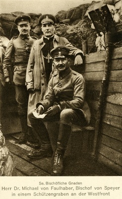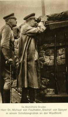 Die schwarz-weiß Aufnahme zeigt "seine Bischöfliche Gnade Herr Dr. Michael von Faulhaber, Bischof von Speyer in einem Schützengraben an der Westfront". "Verlag Dr. Jaeger’sche Buch- und Kunsthandlung, Speyer a. Rh."