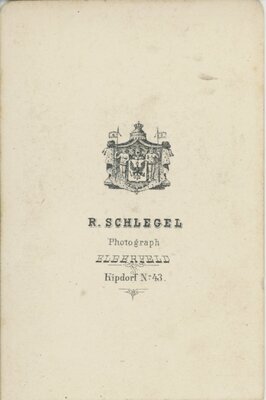Abbildung einer stehenden Dame in langen mitteldunklen Kleid mit einem dunklen Band unter der Brust. Sie steht, leicht nach links gedreht, stützt sich mit ihrer rechten Hand auf eine hohe Stuhllehne. Vom Gürtel bis zum Kragen sind große, runde Knöpfe zu sehen. Am Ärmelansatz und am Ende sieht man Spitzenapplikationen. Sie trägt ihre Haare nach hinten Frisiert und aus ihrem schmalen Gesicht direkt in die Kamera. Auf der Rückseite: R. Schlegel Photograph Elberfeld Kipdorf 43