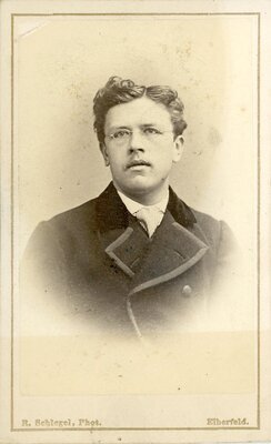 Auf der Karte mit Goldrand ist ein junger, gepflegter Herr in dunkler Jacke, hellem Hemd und heller, gestreifter Krawatte als frontales Brustbild abgebildet. Er ist bartlos, hat seine welligen Haare locker zur Seite gekämmt und schau durch seine zierliche Brille ein wenig nach links aus dem Bild. Unter dem Bild: R. Schlegel Phot. Elberfeld Auf der Rückseite: Raphael Schlegel Photograph. Elberfeld, Kipdorf 43.