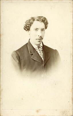 Etwas blasses Brustbild eines jungen Herren in dunklem Sakko und hellem Hemd mit kleinen dunklen Karos. Sein schmales Gesicht hat einen flaumigen Schnurrbart und seine dunklen mittellangen, lockigen Haare sind vom Seitenscheitel, rechts zur Seite gekämmt. Er blickt nach rechts aus dem Bild. Auf der Rückseite: Reutlinger Sohn Photograph Photograph aus Paris Pützhöfchen No. 1 Elberfeld