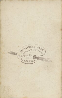 Etwas blasses Brustbild eines jungen Herren in dunklem Sakko und hellem Hemd mit kleinen dunklen Karos. Sein schmales Gesicht hat einen flaumigen Schnurrbart und seine dunklen mittellangen, lockigen Haare sind vom Seitenscheitel, rechts zur Seite gekämmt. Er blickt nach rechts aus dem Bild. Auf der Rückseite: Reutlinger Sohn Photograph Photograph aus Paris Pützhöfchen No. 1 Elberfeld