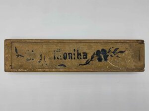 Die Griffeldose, auch als Griffelkasten bekannt, ist aus Holz gefertigt. Auf dem Deckel, der komplett zur Seite herausgeschoben werden kann, sind noch die Reste eines Aufdrucks erkennbar. Dort stand vermutlich umgeben von einem Blumenmuster das Wort Monika. Vermutlich war die Dose einmal gelb angemalt gewesen, es sind jedoch nur noch Farbreste vorhanden und diese auch so abgegriffen, bzw. abgeblättert, dass sich das heute nicht mehr so genau sagen lässt. Innen ist die Dose in drei Fächer aufgeteilt, ein großes, ein mittleres und ein kleines Fach. Dort konnten Griffel, Federhalter, Stifte und andere Schreibutensilien aufbewahrt werden. Vorhanden sind noch ein paar Buntstifte. Die Griffeldose besitzt keinerlei Prägung oder Stempel, die einen Hinweis auf den Hersteller geben.