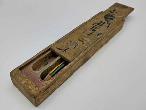 Die Griffeldose, auch als Griffelkasten bekannt, ist aus Holz gefertigt. Auf dem Deckel, der komplett zur Seite herausgeschoben werden kann, sind noch die Reste eines Aufdrucks erkennbar. Dort stand vermutlich umgeben von einem Blumenmuster das Wort Monika. Vermutlich war die Dose einmal gelb angemalt gewesen, es sind jedoch nur noch Farbreste vorhanden und diese auch so abgegriffen, bzw. abgeblättert, dass sich das heute nicht mehr so genau sagen lässt. Innen ist die Dose in drei Fächer aufgeteilt, ein großes, ein mittleres und ein kleines Fach. Dort konnten Griffel, Federhalter, Stifte und andere Schreibutensilien aufbewahrt werden. Vorhanden sind noch ein paar Buntstifte. Die Griffeldose besitzt keinerlei Prägung oder Stempel, die einen Hinweis auf den Hersteller geben.