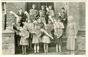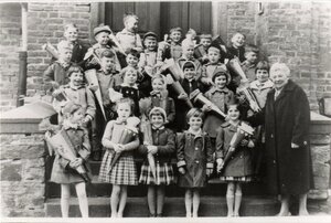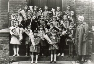 Auf dem schwarz-weiß Foto ist der Jahrgang 1962 bei der Einschulung in die Volksschule Bodendorf/Ahr zusammen mit ihrer Klassenlehrerin Lehrerin Frl. Kohners abgebildet. Das war die letzte Einschulung in der alten Volksschule. Die Kinder tragen die obligatorische Schultüte und sind bei der Treppe vor der Alten Schule aufgestellt. Entstanden ist das Foto auf der Eingangstreppe zur inzwischen abgerissenen Schule. Die Namen der Schüler sind bekannt.
