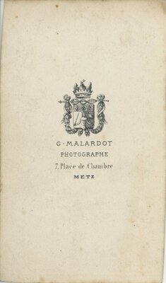 Abbildung einer stehenden jungen Dame mit glatten, in der Mitte gescheitelten, dunklen, straff nach Hinten frisierten Haaren in einem bodenlangen, dunklen Kleid mit weit ausgesstelltem Rock. Sie steht in einem Fotostudio, hinter ihr gibt ein geöffneter Vorhang den Blick auf eine glatte, dunklere Wand frei. Links neben ihr sind ein Polstermöbel und ein geoplstertes Armbänkchen mit Samt und langen Trotteln zu sehen. Darauf hält sie mit ihrer rechten Hand ein krätig reliefiertes Lederalbum fest. Ihr Kleid ist von der sehr engen Taille bis zum Kragen mit großen flachen Knöpfen verschlossen. Sie schaut gerade auf den Betrachter. Auf der Rückseite: G. Malardot Photographe 7. Place du Chambre Maison du Telegraphe METZ