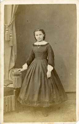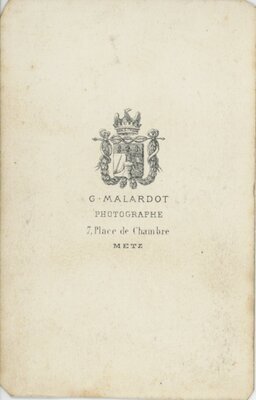 Auf dem Bild ist eine heranwachsende Jugendliche in einem dunklen, nicht ganz bodenlangen Kleid und nicht so hoch geschlossenen Kragen, mit Rüschenbesatz am Saum, Ärmeln und Kragen, zu sehen. Darunter trägt eine sehr helle Bluse, die auch aus den ein wenig kürzeren Ärmeln heraus schaut. Ihre lockigen Haare sind vom Mittelscheitel aus eng nach hinten frisiert. Sie steht neben einem gepolsterten Sitzmöbel mit Armlehne und langen Trotteln. Dahinter befindet sich ein Vorhang mit Posamenten. Sie blickt direkt in die Kamera. Auf der Rückseite: G. Malardot Photographe 7. Place du Chambre Maison du Telegraphe METZ