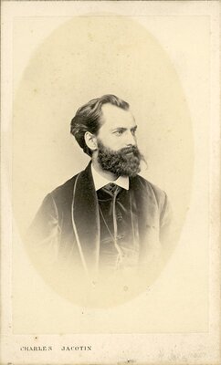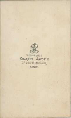 Brustbild eines vollbärtigen Herren mit dunklen halblangen, etwas zur Seite und nach hinten gekämmten, welligen Haaren, der entschlossen nach rechts aus dem Bild blickt. Er trägt eine Jacke mit dazugehöriger Weste, die scheinbar, dem leichten Glanz nach, aus Samt bestehen. Sein Bart ist sehr dicht und dunkel. Unter dem Bild: Charles Jacotin Auf der Rückseite: Photographie Charles Jacotin 37, Boul`de Strasbourg Paris