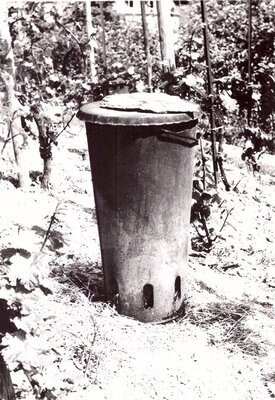 Zu sehen ist ein einfacher Ofen, der zur Vermeidung von Frostschäden eingesetzt wurde. Unten sind die Löcher zu sehen, damit das Feuer Sauerstoff bekommt und gleichmäßig brennt. Das Foto stammt aus der ehemaligen Landes-Lehr- und Versuchsanstalt (LLVA) in Bernkastel Kues.