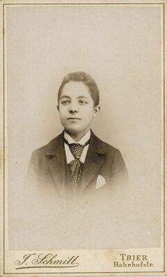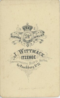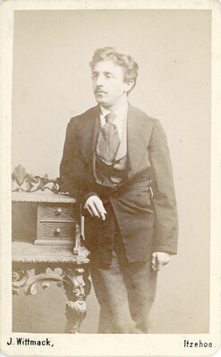Auf der Karte ist ein leger stehender Herr abgebildet, der sich leicht an einen reich verzierten Sekretär lehnt. Er trägt dunkle Hosen, Mantel und Weste und ein helles Hemd mit breiter Krawatte. Er hat eine Andeutung eines Oberlippenbartes und hat seine welligen, mittelhellen Haare zur Seite gekämmt. Unter dem Bild: J. Wittmark, Itzehoe Auf der Rückseite: Photographisches Atelier J. WITTMARK ITZEHOE Zimmermeister Mohr´s Garten Gr. Paschburg No.77