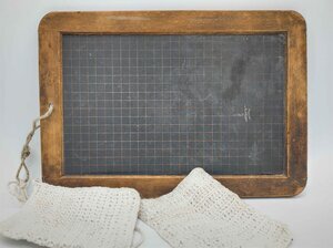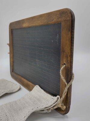 Die Schiefertafel besteht aus einer Schieferplatte, die von einem Holzrahmen eingefasst ist. In die Schiefertafel ist auf der einen Seite ein kariertes Muster und auf der anderen Seite Linien eingeritzt, so dass auf der einen Seite die Matheaufgaben und auf der anderen Seite die übrigen Aufgaben in der Schule bearbeitet werden konnten. Bei den Linien handelt es sich jedoch nicht um einfache Linien, sondern um eine ähnliche Art der Linierung wie die Lineatur 3. Diese Linierung hat einem Abstand von 4mm und dazwischen ist ein Freiraum von 8mm. Auf dieser Seite der Tafel ist auch ein feiner Riss zu erkennen. Am Holzrahmen sind zwei gehäkelte, weiße Läppchen aus Baumwolle befestigt, in welchem zu diesem Zweck ein kleines Loch gebohrt ist. Des Weiteren ist der Rahmen zusammengesteckt und geleimt. Der Rahmen besitzt keinerlei Prägung, die auf einen Hersteller hindeutet.