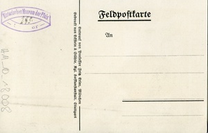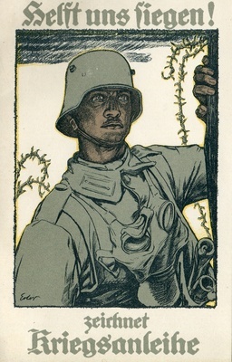 Bildpostkarte mit Druck im Hochformat auf der Vorderseite: Soldat in Feldgrau mit Stahlhelm und Gasmaske, "Helft uns siegen! Zeichnet Kriegsanleihe". Auf der Rückseite: Entwurf von Prof. Fritz Erler, München; gedruckt von Eckstein & Stähle, Kgl. Hofkunstanstalt, Stuttgart.