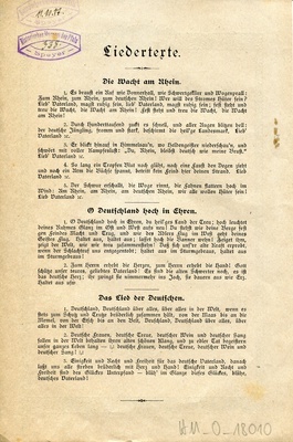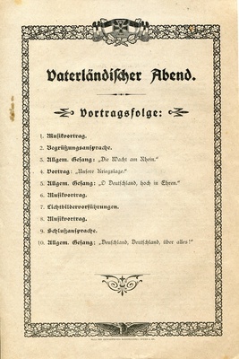 Beidseitig bedrucktes Blatt mit rundumlaufender Eichenlaub-Bordüre im Hochformat auf der Vorderseite und mit Eisernem-Kreuz auf schwarz-weiß-rotem Band über Eichenlaub in der Mitte der oberen Bordüre und stilisiertem Adler an der gegenüberliegenden Stelle des unteren Randes. Darunter befindet sich die Vortragsfolge des Abends in 10 Punkten. Auf der Rückseite befinden sich die Liedtexte. Abdedruckt sind die Strophen 1.-5. des Liedes °Die Wacht am Rhein°, zwei Strophen des Liedes °O Deutschland hoch in Ehren° und die ersten drei Strophen des °Deutschlandliedes/Lied der Deutschen°. Druck der Zechnerschen Buchruckerei, Speier, A. RH.