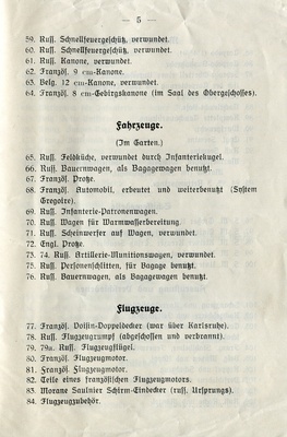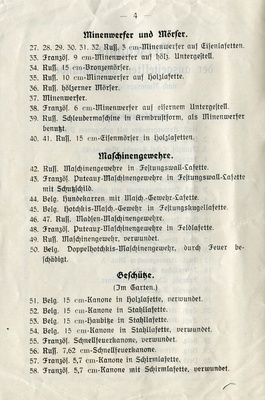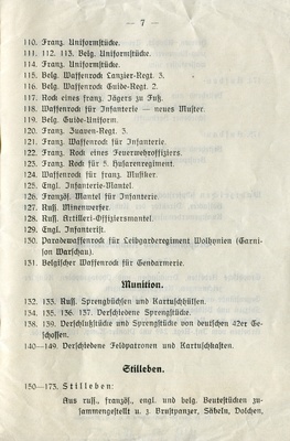Achtseitige Broschüre der "Deutschen Kriegsaustellung" in Mannheim aus dem Jahr 1916. Abgedruckt ist ein nummeriertes Verzeichnis der ausgestellten Objekte (Handfeuerwaffen, Minenwerfer und Mörser, Maschinengewehre, Geschütze, Fahrzeuge, Flugzeuge, Marine-Abteilung, Schiffsmodelle, Ausrüstung und Verschiedenes, Munition, Stilleben). Druck: Dr. Haas’sche Buchdruckerei G.M.B.H., Mannheim. Guter Zustand, wenige Knicke.
