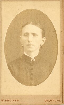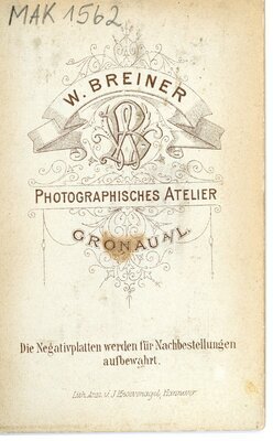 Die Frau trägt ein dunkles Oberteil mit einem dunklen sowie einem hellen Stehkragen und einer Knopfleiste im Brustbereich.Sie hat einen Mittelscheitel und die glatten Haare streng nach hinten gekämmt.Außerdem trät sie eine kleine Brosche am Kragen und Ohrringe.Ihr Blick geht rechts an der Kamera vorbei. Die Rückseite ist kunstvoll mit Ornamenten gestaltet, die das Logo des Fotografen W. Breiner aus Gronau a/ umranken. Darunter der Hinweis daß die Platten für Nachbestellungen aufbewahrt werden.