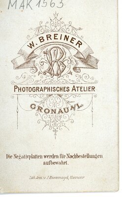 Die junge Frau steht mit übereinander gelegten Händen an einem gepolstertem Bänkchen,im Hintergrund ist eine Atelierbemalung zu erkennen.Sie trägt einen dunklen, in Falten gelegten Rock sowie ein dunkles langärmliges Oberteil mit Stehkragen und leichten Puffärmeln. Das Oberteil reicht bis über die Hüften und hat breite quer verlaufende Falten, im Brustbereich ist es zweireihig geknöpft. Am Kragen und an den Armen sind helle Rüscheneinsätze. Sie hat einen Mittelscheitel und die glatten Haare streng nach hinten gekämmt. An der linken Hand trägt sie einen Ring, sowie eine kleine Brosche am Kragen und eine Kette mit rundem Anhänger .Die Rückseite ziert das Emblem des Fotografen W. Breiner aus Gronau a/L. mit dem Hinweis daß die Platten für Nachbestellungen aufbewahrt werden.