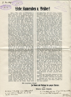 Dritter Rundbrief zu Weihnachten 1915 des Pfarrers Hans Schmidt an die Soldaten im Felde seiner Gemeinde in Niederkirchen (Ostertal) mit dem Titel "Liebe Kameraden u. Brüder!". Auf der Vorderseite befindet sich der eigentliche Rundbrief, auf der Rückseite sind zusätzlich noch Nachrichten aus der Pfarrei abgedruckt. Unter anderem sind dies: Gefallene, Auszeichnungen u. Beförderungen, Verwundete, Hochzeiten, Taufen und Beerdigungen.