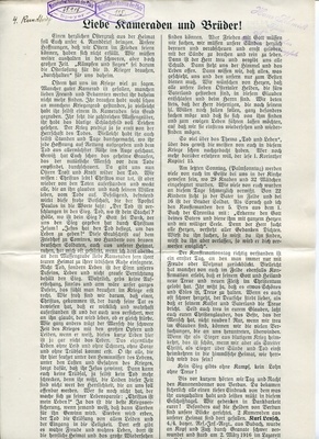 Vierter Rundbrief des Pfarrers Hans Schmidt an die Soldaten im Felde seiner Gemeinde in Niederkirchen (Ostertal) mit dem Titel "Liebe Kameraden u. Brüder!". Abgedruckt sind, auf der Vorderseite beginnend der eigentliche Rundbrief, auf der Rückseite sind zusätzlich noch Nachrichten aus der Pfarrei abgedruckt. Unter anderem sind dies: Gefallene, Auszeichnungen u. Beförderungen, Verwundete, Hochzeiten, Taufen und Beerdigungen.
