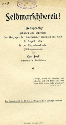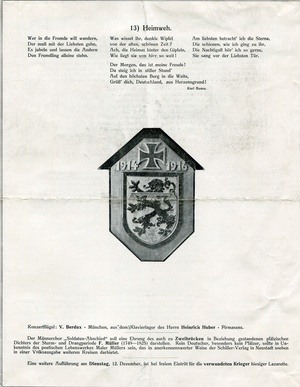 4-seitiges Faltblatt mit Vortrags-Ordnung und 13 "Wortlaut(en) der Gesänge" der "Wohltätigkeits-Aufführungen" im städtischen Fruchthallsaal in Zweibrücken, "zu Gunsten einer Weihnachtsspende für unsere verwundeten Krieger". Auf der letzten Seite befindet sich ein Foto-Druck des Zweibrücker "Kriegswahrzeichen". Druck: Zweibrücker Druckerei G.m.b.H.