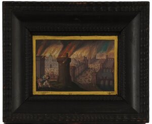 Aeneas im linken Vordergrund des Miniaturbildchens flieht aus der brennenden Stadt Troia. Er wird begleitet durch seinen kleinen Sohn Silvius und seinen Vater Anchises, den er auf den Armen trägt. Troia wird als antike Stadtkulisse aus zeitgenössischer Sicht geschildert. Inmitten eines zentralen Hofes, vor einem stattlichen Gebäude, erkennt man das troianische Pferd, das nach der Idee von Odysseus gebaut, zum Fall der Stadt beigetragen hatte. Kämpfende Soldaten und brennende Städte waren dem Künstler in der Zeit des gerade endenden Dreißigjährigen Krieges sicherlich präsent. Besserer wurde um 1600 in Speyer geboren und kam um 1640 zur Zeit des Dreißigjährigen Krieges nach Straßburg, wo er das Bürgerrecht erhielt und im Alter von 57 Jahren gestorben ist. Er verfügte wohl um gute Verbindungen zu Straßburger Sammlern aus dem reichen Bürgertum der Stadt. Darüber hinaus hielt er Kontakt zu dem Künstlerkreis um Friedrich Brentel. Der rahmenden Goldrand trägt links unten die Bezeichnung des Künstlers: Hans Jacob Besserer fec. re:1648.