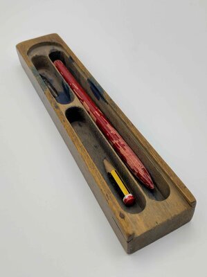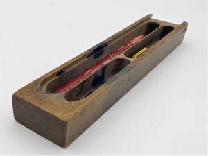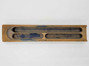 Die Griffeldose, auch als Griffelkasten bekannt, ist aus Holz gefertigt. Ursprünglich verfügte diese Dose über einen Deckel, der gänzlich zur Seite herausgeschoben werden konnte, dieser ist jedoch nicht mehr vorhanden. In der Dose ist vermutlich einige Male blaue Tinte ausgelaufen, so ließen sich zumindest die blauen Flecken in der Dose erklären. An einer Seite ist ein Nagel von oben in die Dose geschlagen, vermutlich um zu verhindern, dass das Holz an dieser Stelle bricht, bzw. splittert. Diese Stelle ist bei Griffeldosen leicht anfällig für Bruchstellen, da dort andauernd der Deckel reingeschoben und herausgezogen wurde. Innen ist die Dose in drei Fächer aufgeteilt, ein großes, ein mittleres und ein kleines Fach. Dort konnten Griffel, Federhalter, Stifte und andere Schreibutensilien aufbewahrt werden. Vorhanden sind noch ein kleiner Bleistift, ein Federhalter und eine Stahlfeder. Die Griffeldose besitzt keinerlei Prägung oder Stempel, die einen Hinweis auf den Hersteller geben.