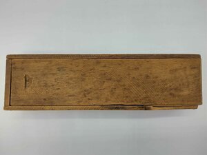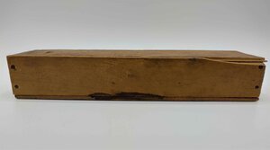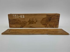 Die Griffeldose, oder auch Griffelkasten genannt, ist aus Holz gefertigt und besitzt einen Deckel, der gänzlich zur Seite herausgeschoben werden kann. Im Gegensatz zu den meisten Dosen ist diese Dose nicht gänzlich zusammengeklebt, sondern die einzelnen Teile sind miteinander vernagelt. Insgesamt sind bei dieser Dose 14 Nägel verbaut. Am oberen Rand ist auch schon etwas Holz weggebrochen. Der Innenraum dieser eher kleinen Dose ist nicht in verschiedene Fächer aufgeteilt und diente der Aufbewahrung von Stiften, Stahlfedern, Tinte und anderen Schreibmaterialien. Ein grüner Bleistift der Marke "Superfine" ist noch vorhanden. Die Dose besitzt keinerlei Prägung oder Stempel eines Herstellers, sie kann aber ebenso wahrscheinlich von der Familie des ehemaligen Besitzers selbst hergestellt worden sein. Auf der Unterseite der Dose ist bereits eine alte Inventarisierungsnummer geschrieben: 582 - 82.
