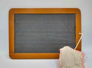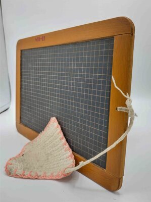 Die Schiefertafel besteht aus einer Schieferplatte, die von einem Holzrahmen eingefasst ist. In die Schiefertafel ist auf der einen Seite ein kariertes Muster und auf der anderen Seite Linien eingeritzt, so dass auf der einen Seite die Matheaufgaben und auf der anderen Seite die übrigen Aufgaben in der Schule bearbeitet werden konnten. Auf der Seite mit der Linierung steht geschrieben: "Olli Sauer war hier". Am Holzrahmen ist ein weißes gehäkeltes Stoffläppchen mit eine rosafarbenen Rand befestigt, in welchem zu diesem Zweck ein kleines Loch gebohrt ist. Durch die Tafel zieht sich auf der Seite mit der Linierung ein Riss, den man eher fühlen als sehen kann. Der Holzrahmen ist zusammengesteckt und geleimt und es ist keinerlei Prägung eines Herstellers vorhanden. Jedoch ist die Tafel mit einer ehemaligen Inventarisierungsnummer gekennzeichnet: 450-83.