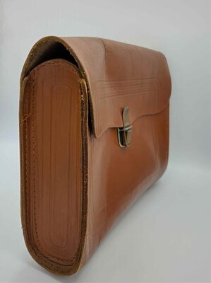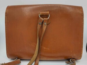 Die Schultasche, oder auch der Schulranzen ist aus hellbraunem Leder gefertigt. Sie besitzt vorne eine Schnapp-Schnalle, an welcher der Deckel geschlossen werden kann. Auf der Rückseite sind die zwei Träger mittig befestigt, sie sind an dem Boden der Tasche auf der einen Seite mit einer Schnalle befestigt und auf der anderen Seite kann der Träger einfach ein- und wieder ausgehängt werden. So ließ sich die Tasche leichter an- und wieder ausziehen. Die Tasche besitzt auf der Vorderseite ein viereckiges Muster. Der Innenraum der Schultasche besteht aus einem einzigen Fach und es ist noch eine türkis-grüne Plastikdose vorhanden. Auf der Schnappschnalle, die vermutlich ursprünglich vergoldet war, ist das Logo des Herstellers "Garantie" eingeprägt, ein Hufeisen, dass um eine Krone (oder Ähnliches) gehalten wird.