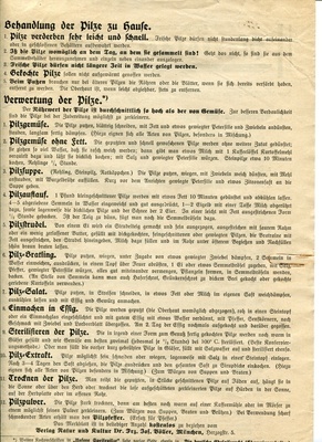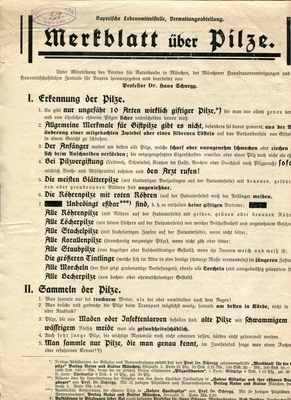 Einseitig bedrucktes Flugblatt der "Bayerischen Lebensmittelstelle, Verwaltungsabteilung ", mit dem Titel "Merkblatt über Pilze", "Unter Mitwirkung des Vereins für Naturkunde in München, der Münchener Hausfrauenvereinigung und der Hauswirtschaftlichen Zentrale für Bayern (,) herausgegeben und bearbeitet von Professor Dr. Hans Schnegg". Anhand von vier Oberthemen (I. Erkennung der Pilze, II. Sammeln der Pilze, III. Behandlung der Pilze zu Hause, IV. Verwertung der Pilze) und jeweiligen merksatzähnlich formulierten Unterpunkten, werden hier praktische Hinweise zur Lebensmittelversorgung in der Kriegszeit erteilt.