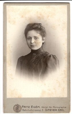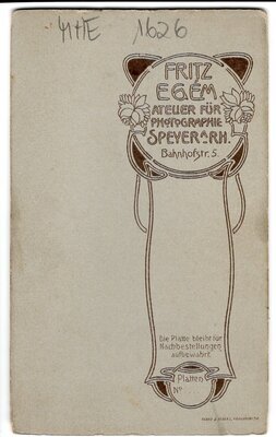 Die junge Dame hat einen freundlichen Blick und schaut gerade in die Kamera. Durch die Vignettierung der Aufnahme ist nur die Oberbekleidung sichtbar. Eine dunkle hochgeschlossene Bluse, am Stehkragen mit einer Brosche verziert. Die Haare zusammen nach hinten gebunden. Auf der Vorder- und Rückseite des Porträts ist eine Eigenwerbung des Ateliers Fritz Egem aus Speyer/Rh aufgedruckt. Zusätzlich der Hinweis, dass die Photoplatte für Nachbestellungen aufbewahrt wird.
