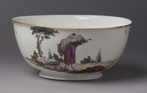 Die Schale ist mit zwei Darstellungen fahrender Händler bemalt: einer Blumenverkäuferin und einem Mann, der einen großen Sack auf dem Rücken trägt. Sie stehen in der Bildtradition von Stichen und Radierungen zu den so genannten "Cris de Paris". Diese besonders für Paris typischen Straßenhändler, Ausrufer und Anbieter einfacher Dienstleistungen waren insbesondere im 18. Jh. beliebte Motive für ganze Grafikserien. Blattfolgen mit eher idealisierendem Blick auf diese einfache arbeitende Bevölkerung wie etwa von François Boucher oder Edme Bouchardon fanden weite Verbreitung und wurden vielfach kopiert und zitiert. Im 18. wurde das Thema der "Cris de Paris" auch von Porzellanmanufakturen aufgegriffen. Es entstanden sowohl Serien von Porzellanfiguren als auch Tafelservice mit aufgemalten Darstellungen der Pariser Marktschreier. Die Schale wurde von Johann Georg Lamprecht bemalt. Der angesehene Figurenmaler war von 1766 bis 1772 in Frankenthal und in den 1770er und 1780er Jahren in Wien, Paris und Sèvres tätig. [Johanna Kätzel]