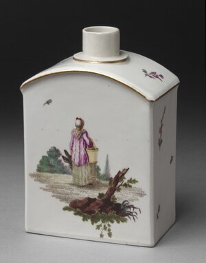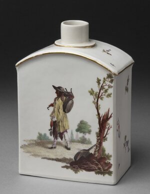 Die Teedose ist mit zwei Darstellungen fahrender Händler bemalt: einem Kupferschmied bzw. Kesselmacher und einer Geflügelverkäuferin. Sie stehen in der Bildtradition von Stichen und Radierungen zu den so genannten "Cris de Paris". Diese besonders für Paris typischen Straßenhändler, Ausrufer und Anbieter einfacher Dienstleistungen waren insbesondere im 18. Jh. beliebte Motive für ganze Grafikserien. Blattfolgen mit eher idealisierendem Blick auf diese einfache arbeitende Bevölkerung wie etwa von François Boucher oder Edme Bouchardon fanden weite Verbreitung und wurden vielfach kopiert und zitiert. Im 18. wurde das Thema der "Cris de Paris" auch von Porzellanmanufakturen aufgegriffen. Es entstanden sowohl Serien von Porzellanfiguren als auch Tafelservice mit aufgemalten Darstellungen der Pariser Marktschreier. Die Teedose wurde von Johann Georg Lamprecht bemalt. Der angesehene Figurenmaler war von 1766 bis 1772 in Frankenthal und in den 1770er und 1780er Jahren in Wien, Paris und Sèvres tätig. [Johanna Kätzel]