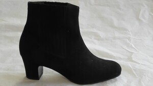 Ein Einzelner Schwarzer Pumps aus Veloursleder. Runde Form, Schuhgröße 38. Der Schuh verfügt über einen metallgenagelten, mit Veloursleder bezogenen Absatz (5 cm). Er verfügt über Durchbrüche an Schuhseite und Schuhöffnung und eine Schnürung mit Ösen an der Innenseite.