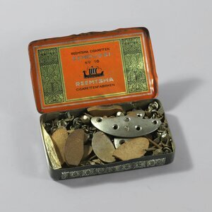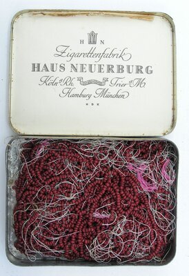 Sehr kleine kunkelrote Rocaillesperlchen aus Glas sind auf Garnfäden (Gesamtgewicht 35 Granmm) aufgezogen und werden in einer Zigarettendose aus Blech aufbewahrt. Die Perlenfäden bilden ein Bündel aus ungeordneten Fäden, einzelne Perlchen liegen lose auf dem Boden der Zigarettendose. Die Rocaillesperlchen dienen der Herstellung von Schmuck und der Verzierung von Andenken- und Reliquienbildern und Reliquienkapseln. Die rechteckige Zigarettendose mit aberundeten Ecken enthielt in seiner Erstverwendung Zigaretten der Firma Haus Neuerburg GmbH mit Sitz in Köln am Rhein, Trier an der Mosel sowie Hamburg und München. Auf der Außenseite des Deckels ist das Firmenemblem "H N" und dem Namen und Anzahl "10 Güldenring Zigaretten" reliefartig geprägt, innen klebt ein Papierzettel. Die Schauseiten der Zigarettendose sind goldfarben galvanisiert, der Deckel ist lose. Herkunft: Ehemaliges Kloster St. Clara, Petrisberg, Trier, 1920 - 2018