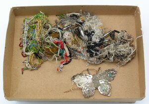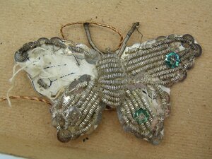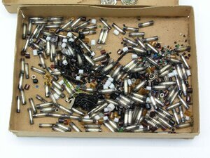 In einer Pappschachtel werden verschiedenartige gläserne Röhren und Perlen aufbewahrt. Sie dienen der Herstellung von Schmuck, Mode, Handtaschen und für die Verzierung von Reliquienbildern und -kapseln. In der Mehrzahl sind in dieser Schachtel sechskantige Röhrchen aus transparentem Glas, das innen mit Silbernitrat gefärbt wurde, die jeweiligen Enden sind geschwärzt. Außerdem sind noch kurze weiße und braune Röhrchen, ebenfalls 6-kantig, verschiedenfarbige Rocaillesperlen, schwarze Röhrchen, teilweise auf Fäden aufgezogen oder zu Ornamenten verknotet sowie ein Knäuel aus Fäden mit den verschiedensten Glasperlen in der Schachtel enthalten. Ein unfertiger Schmetteling aus silberfarbenem Perdraht und silberfarbigen und grünen Pailetten liegt ebenfalls in der Schachtel. Der Schmetterling ist handgearbeitet: auf einem ausgeschnittenen Karton ist ein Muster für die Verzierung gezeichnet. Die Einzelteile sind anhand des Musters auf den Karton genäht, auf der Rückseite verlaufen die Fäden, über die einmal ein Papier geklebt war. In dem Karton steckt eine abgebrochene Nähnadel. Ein kleiner Stiefel aus grün-rot-schwarz bemaltem Karton befindet sich noch unter den Glasperlen (1,1 x 1 cm). Die einfache recheckige Pappschachtel enthielt in seiner Erstverwendung Harmonicas von der Firma M. Hohner, auf einer Schmalseite des Deckels klebt außen ein Papieretikett der Firma Hohner und ein kleineres ovales Etikett mit den Buchstaben "C G" auf blauem Grund. Gewicht aller Glasperlen mit Fäden: 167 Gramm Herkunft: Ehemaliges Kloster St. Clara, Petrisberg, Trier, 2920 - 2018