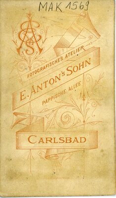 Die Vignettenaufnahme in einem ovalen Passepartout, zeigt eine Frau mit streng nach hinten frisiertem Haar, das im Stirnbereich aufwendig mit einer Brennschere in große Locken gelegt ist. Sie trägt eine Strickjacke mit rundem Ausschnitt, in einer gedeckten Farbe mit doppelter Knopfleiste. Am Kragen ist ein heller Spitzeneinsatz zu erkennen, außerdem trägt sie eine Brosche und Ohrringe.Ihr Blick geht links an der Kamera vorbei. Auf der Rückseite der Aufnahme ist die Eigenwerbung mit Logo "Fotografisches Atelier E. Anton´s Sohn", in graphisch aufweniger Form aufgedruckt.