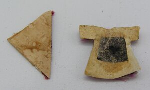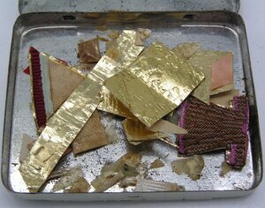 In einem Blechschächtelchen befinden sich 13 Stückchen von roter, rosa und weißer Seide in unterschiedlichen Größen, in die der heilige Rock in Trier eingepackt war, wahrscheinlich von 1891 bis 1933. Ein weißes Seidenstückchen ist in Pergamentpapier eingepackt. Ein größeres Stück braun-rosafarbener Seide hat die Form des ausgebreiteten heiligen Rocks, es ist auf ein Stück in goldener Farbe beschichtetes Papier geklebt (hl. Rock: 1,6 x 1,6 cm). Die Seide gilt als Reliquie 3. Grades, da sie mit einem Gegenstand aus dem Besitz eines Heiligen in Berührung gekommen war und wird in Klosterwerkstätten in kleinsten Stückchen zu Reliquienbilder und -kapseln oder Reliquienkästen verarbeitet, so auch im Kloster St. Clara. Außerdem befinden sich in der Schachtel kleinere Wachsstückchen und -krümel sowie verschiedene Stücke von Papier, das auf einer Seite goldfarben beschichtet und reliefiert ist. Die Blechdose mit Deckel enthielt in ihrer Erstverwendung 20 Pyramidon-Tabletten der Firma Bayer-Leverkusen. Herkunft: Ehemaliges Kloster St. Clara, Petrisberg, Trier, 1920 - 2018