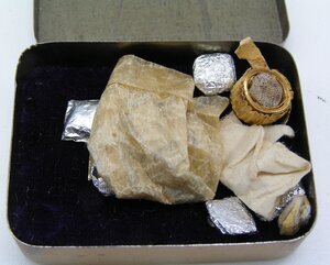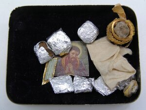 In einer Blechdose befinden sich 1) sieben in silberfarbenes Staniolpapier eingeschlagene Wachsplättchen, 2) ein Stückchen hellblaue Seide, auf Karton geklebt, 3) ein Päckchen mit unbekanntem Inhalt, das in feinen Mull eingeschlagen und verklebt ist, 4) eine Reliquie der S. Christina M[ärtyrer], das in ein Papierröllchen mit einer Goldkante eingewickelt ist, 5) eine in feinen Mull eingepackte Reliquie des Fortunatus; sie ist in ein Stückchen Papier eingeschlagen, das innen mit Bleistift beschriftet ist: Fortunatus, 6) in Papier befinden sich zwei Reliquienpäckchen, das eine in Papier, das andere in Pergamentpapier eingeschlagen, und eine Inschrift mit goldenen Lettern auf grünem Grund: S. Placida M. An einem Ende ist ein Garnfaden mit einer Paillette und silbernem Spiraldraht befestigt. Der Boden der Blechdose ist mit einem Stück lila Samt ausgelegt, darauf klebt mittig ein Bildnis (Photo) eines betenden Heiligen. Die rechteckige Blechdose mit abgerundeten Kanten und separatem Deckel enthielt in ihrer Erstverwendung ca. 16 gr. Rheila-Perlen gegen Husten und Heiserkeit. Die Ober- und Unterseiten sind entsprechend bedruckt. Herkunft: Ehemaliges Kloster St. Clara, Petrisberg, Trier, 1920 - 2018