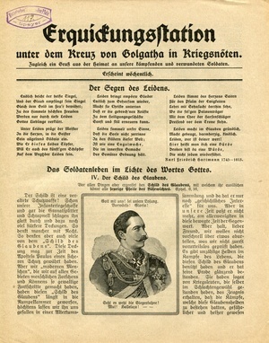 Missionsblatt "Erquickungsstation unter dem Kreuz von Golgatha in Kriegsnöten. Zugleich ein Gruß aus der Heimat an unsere kämpfenden und verwundeten Soldaten". 4-blättriges Missionsblatt der Evangelischen Vereinsbuchhandlung Kaiserslautern. Kein Datum. Schriftleitung: Professor Krafft in Kaiserslautern. Druck: Emil Rohr Buchdruckerei und Verlagsgesellschaft m.b.H., Kaiserslautern.
