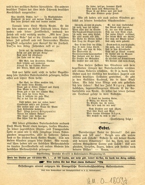 Missionsblatt "Erquickungsstation unter dem Kreuz von Golgatha in Kriegsnöten. Zugleich ein Gruß aus der Heimat an unsere kämpfenden und verwundeten Soldaten". 4-blättriges Missionsblatt der Evangelischen Vereinsbuchhandlung Kaiserslautern. Kein Datum. Schriftleitung: Professor Krafft in Kaiserslautern. Druck: Emil Rohr Buchdruckerei und Verlagsgesellschaft m.b.H., Kaiserslautern.