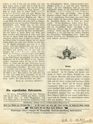 Missionsblatt "Erquickungsstation unter dem Kreuz von Golgatha in Kriegsnöten. Zugleich ein Gruß aus der Heimat an unsere kämpfenden und verwundeten Soldaten". 4-blättriges Missionsblatt der Evangelischen Vereinsbuchhandlung Kaiserslautern. Schriftleitung: Professor Krafft in Kaiserslautern. Druck: Emil Rohr Buchdruckerei und Verlagsgesellschaft m.b.H., Kaiserslautern.