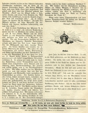 Missionsblatt "Erquickungsstation unter dem Kreuz von Golgatha in Kriegsnöten. Zugleich ein Gruß aus der Heimat an unsere kämpfenden und verwundeten Soldaten". 4-blättriges Missionsblatt der Evangelischen Vereinsbuchhandlung Kaiserslautern. Schriftleitung: Professor Krafft in Kaiserslautern. Druck: Emil Rohr Buchdruckerei und Verlagsgesellschaft m.b.H., Kaiserslautern.