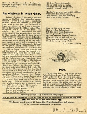 Missionsblatt "Erquickungsstation unter dem Kreuz von Golgatha in Kriegsnöten. Zugleich ein Gruß aus der Heimat an unsere kämpfenden und verwundeten Soldaten". 4-blättriges Missionsblatt der Evangelischen Vereinsbuchhandlung Kaiserslautern. Schriftleitung: Professor Krafft in Kaiserslautern. Druck: Emil Rohr Buchdruckerei und Verlagsgesellschaft m.b.H., Kaiserslautern.