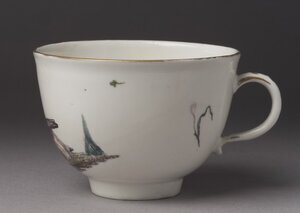 Die Tasse ist mit einer Darstellung einer fahrenden Händlerin bemalt, die sich auf einen Stuhl gesetzt und ein Tablett oder einen Bauchladen auf dem Schoß abgestellt hat. Die Darstellung steht in der Bildtradition von Stichen und Radierungen zu den so genannten "Cris de Paris". Diese besonders für Paris typischen Straßenhändler, Ausrufer und Anbieter einfacher Dienstleistungen waren insbesondere im 18. Jh. beliebte Motive für ganze Grafikserien. Blattfolgen mit eher idealisierendem Blick auf diese einfache arbeitende Bevölkerung wie etwa von François Boucher oder Edme Bouchardon fanden weite Verbreitung und wurden vielfach kopiert und zitiert. Im 18. wurde das Thema der "Cris de Paris" auch von Porzellanmanufakturen aufgegriffen. Es entstanden sowohl Serien von Porzellanfiguren als auch Tafelservice mit aufgemalten Darstellungen der Pariser Marktschreier. Die Tasse wurde von Johann Georg Lamprecht bemalt. Der angesehene Figurenmaler war von 1766 bis 1772 in Frankenthal und in den 1770er und 1780er Jahren in Wien, Paris und Sèvres tätig. [Johanna Kätzel]